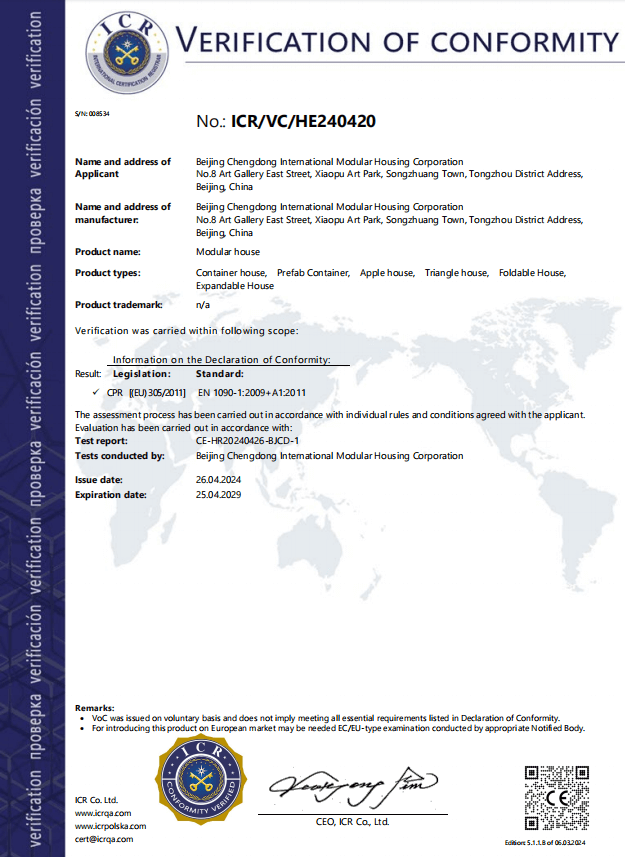 Container houses manufactured by CDPH are designed and built in full compliance with relevant European Union CE standards, ensuring safety, reliability, and environmental responsibility.